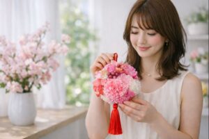 桜色の花毬に、朱の房飾り。 掛けるだけで“ハレ”の空気をつくる、和モダン壁掛けアレンジです。